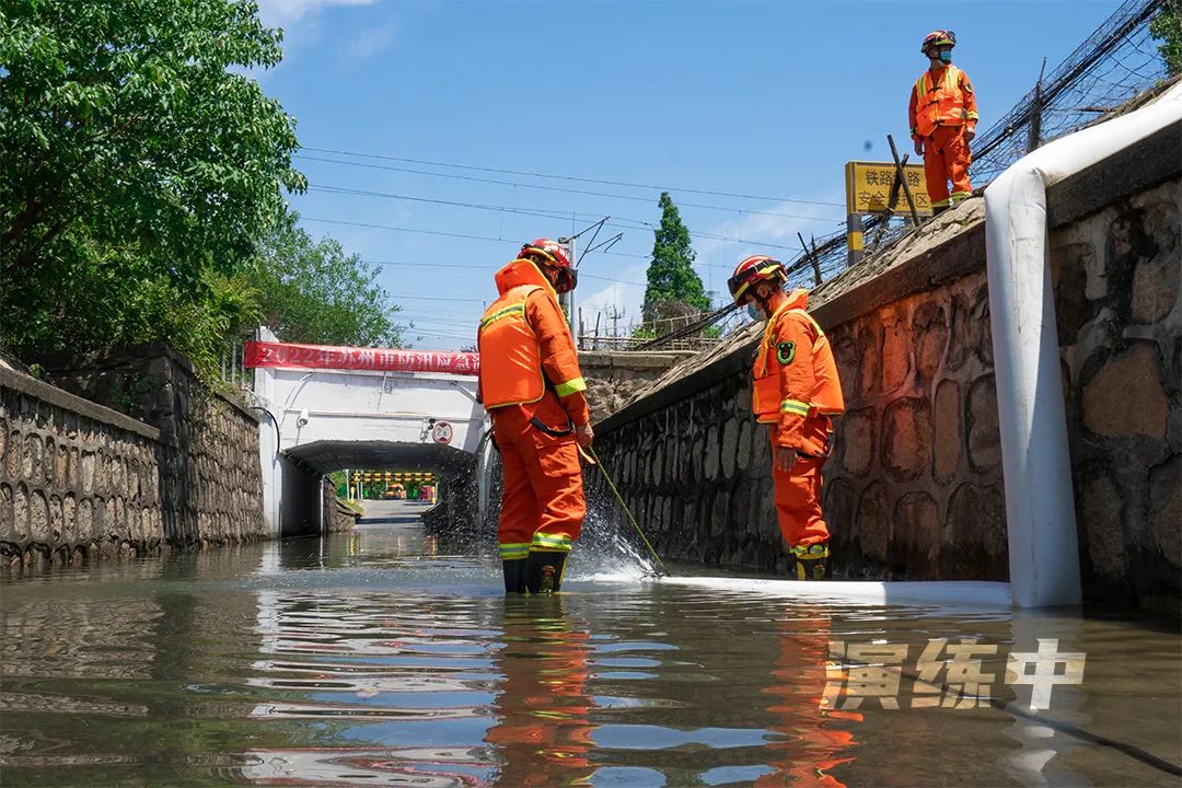 以受強對流天氣影響,蘇州市局部地區遭遇特大暴雨,導致陽澄湖、京杭運河水位快速上升,唯亭街道部分地段內澇嚴重,急需搶救、轉移、安置受災群眾為背景:市級演練模擬雙馬街下穿滬寧鐵路通道排水泵房停電,通道內大量積水觸發防汛監測警報,園區、街道兩級立即組織疏導搶險應急;區級演練則模擬了某過渡房小區內澇嚴重,部分居民受困,急需組織排澇和人員轉移的場景。