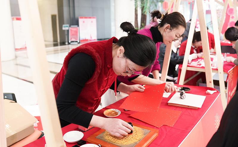 今年是中國春節(jié)申遺成功后的首個“非遺版”春節(jié),非遺文化是此次活動的一大亮點,在非遺互動體驗區(qū),樓宇企業(yè)員工們熱情參與木刻版畫拓印、銅胎掐絲琺瑯等傳統(tǒng)技藝體驗,親手制作新春年畫、精美飾品等,感受非遺文化的獨特魅力。