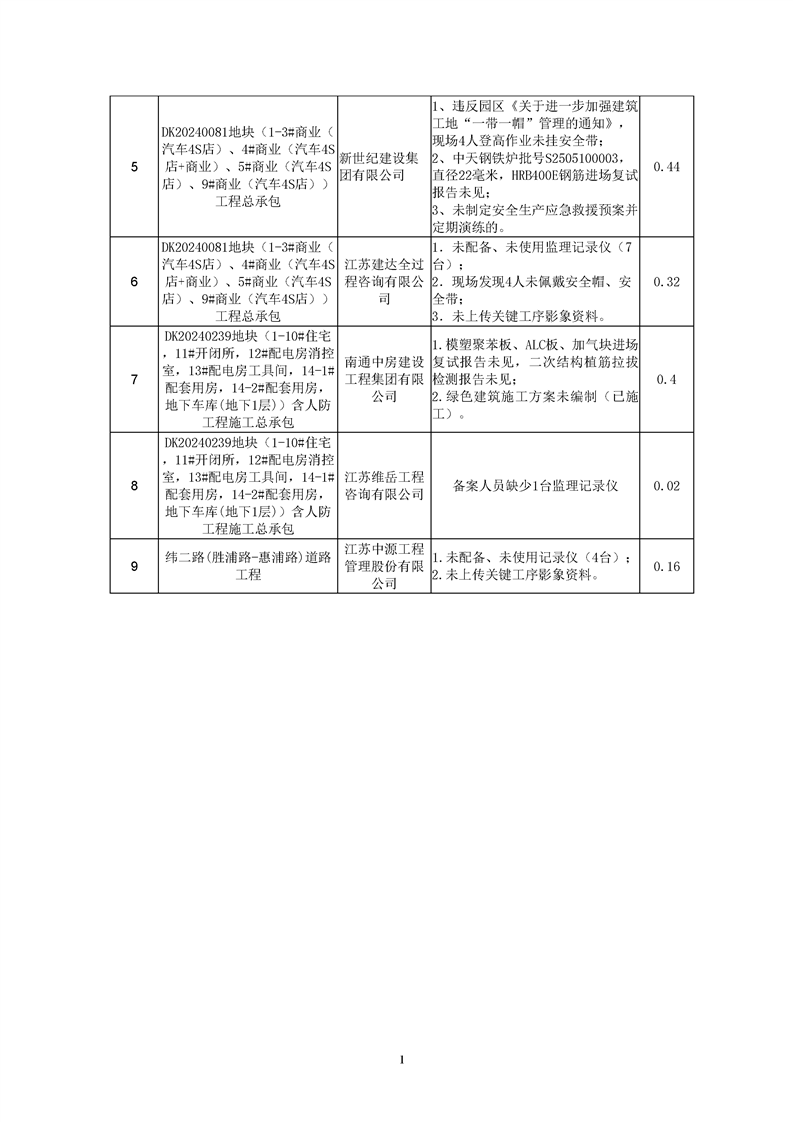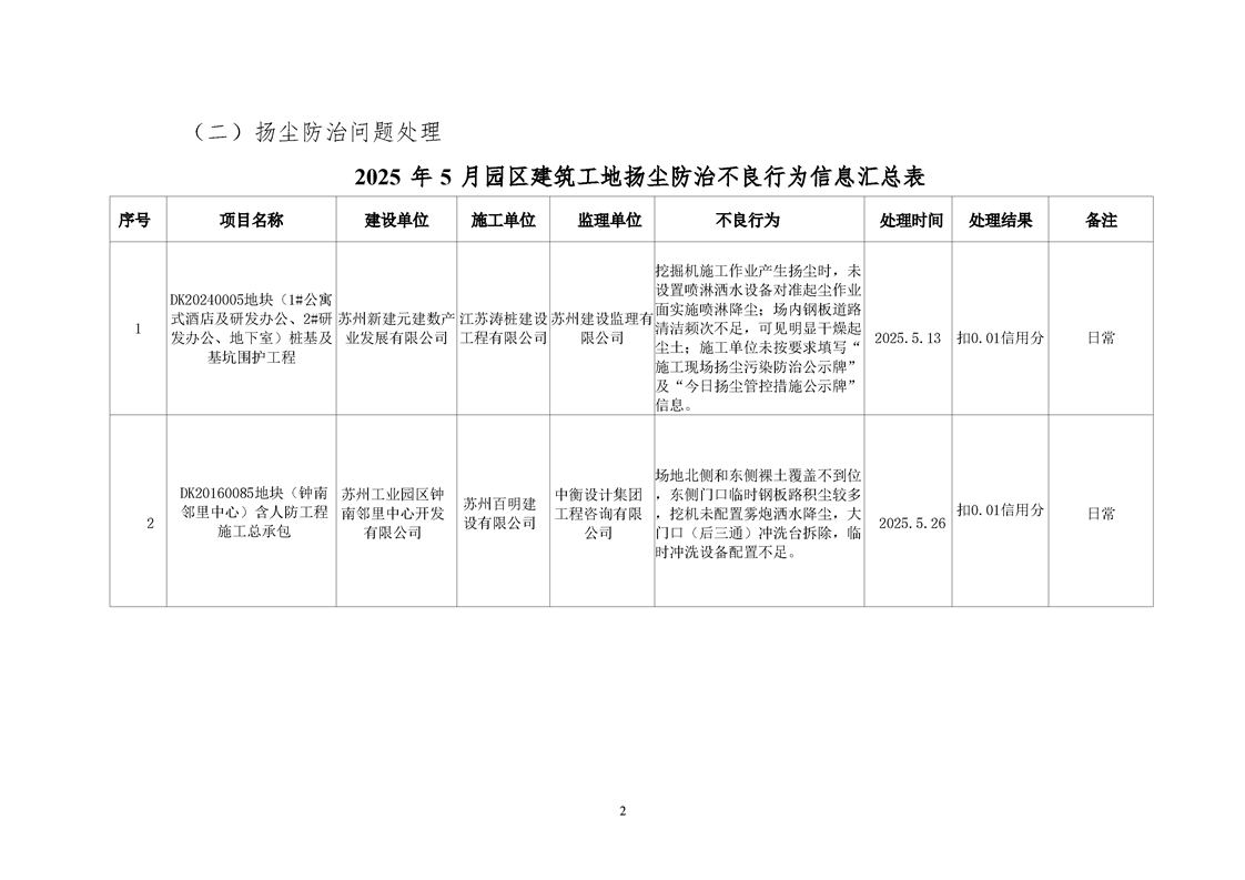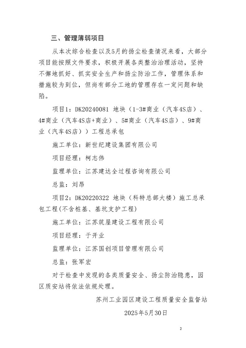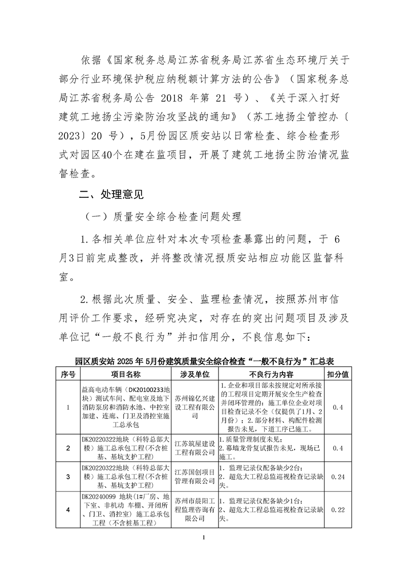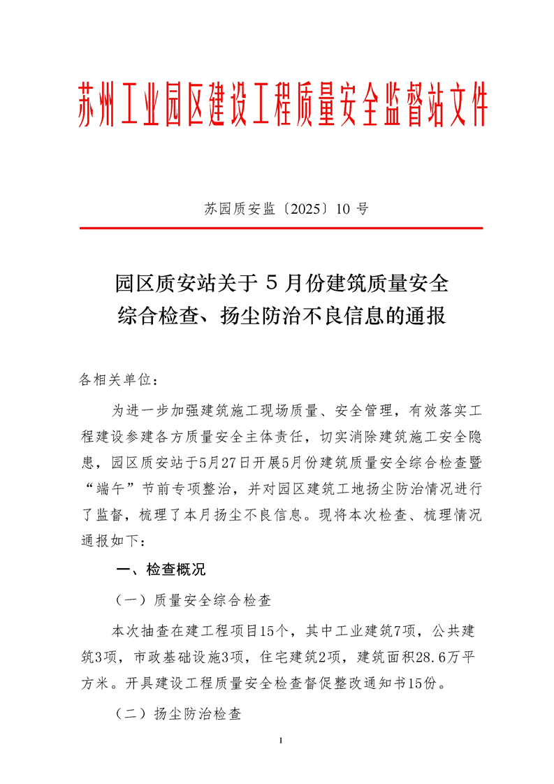 園區(qū)質(zhì)安站關(guān)于5月份建筑質(zhì)量安全綜合檢查、揚塵防治不良信息的通報