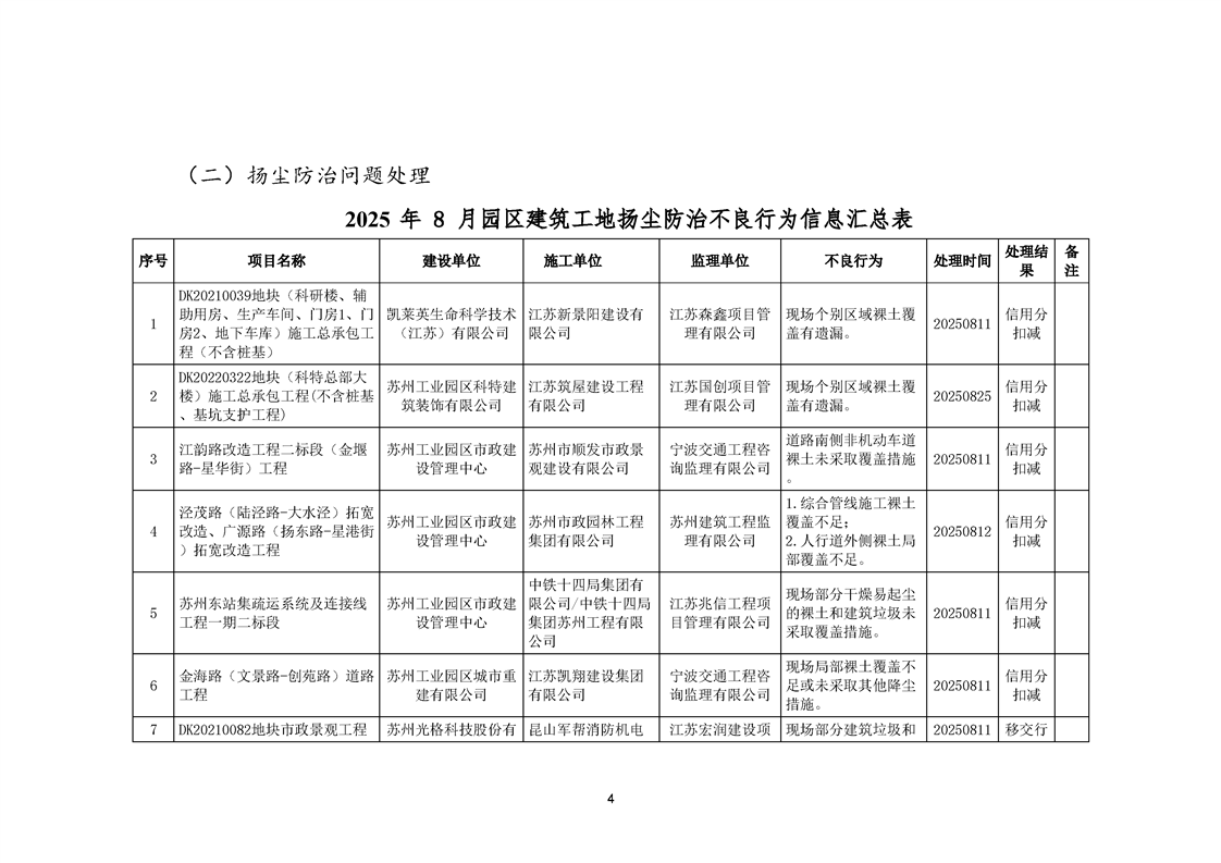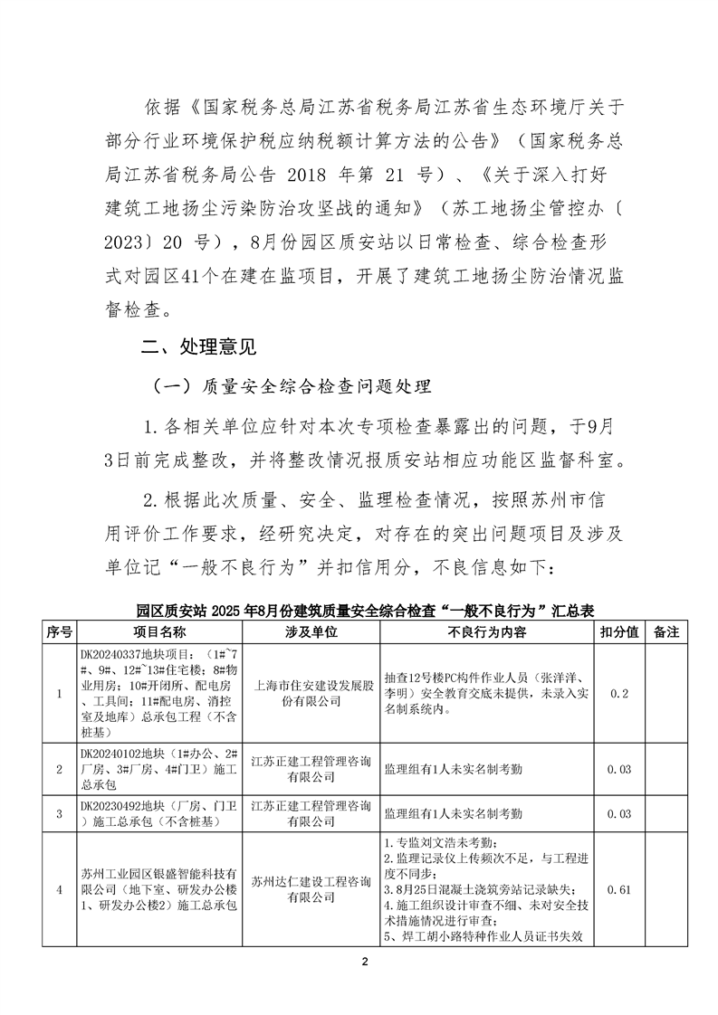 園區質安站關于8月份建筑質量安全綜合檢查、揚塵防治不良信息的通報