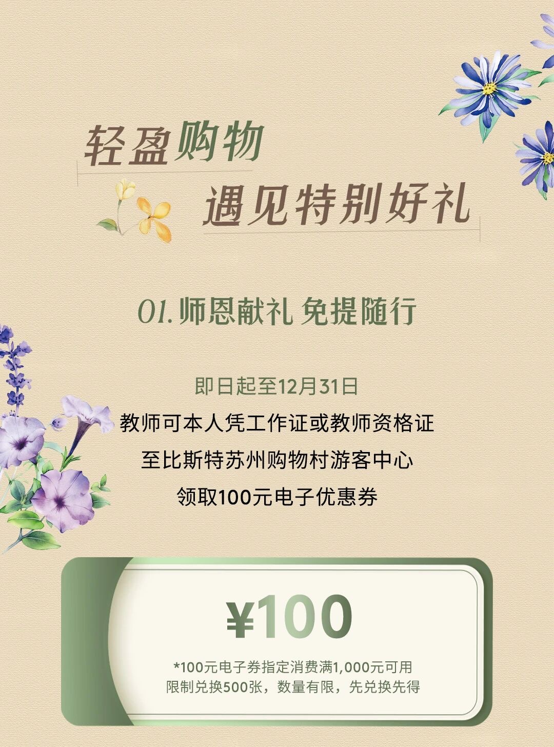粉筆寫春秋,感恩教師情。在第41個教師節(jié)來臨之際,為弘揚尊師重教之風,蘇州工業(yè)園區(qū)聯(lián)動商貿(mào)、文旅等領域,推出一系列專屬優(yōu)惠活動,用誠意與驚喜,向辛勤耕耘的教師們致以敬意。