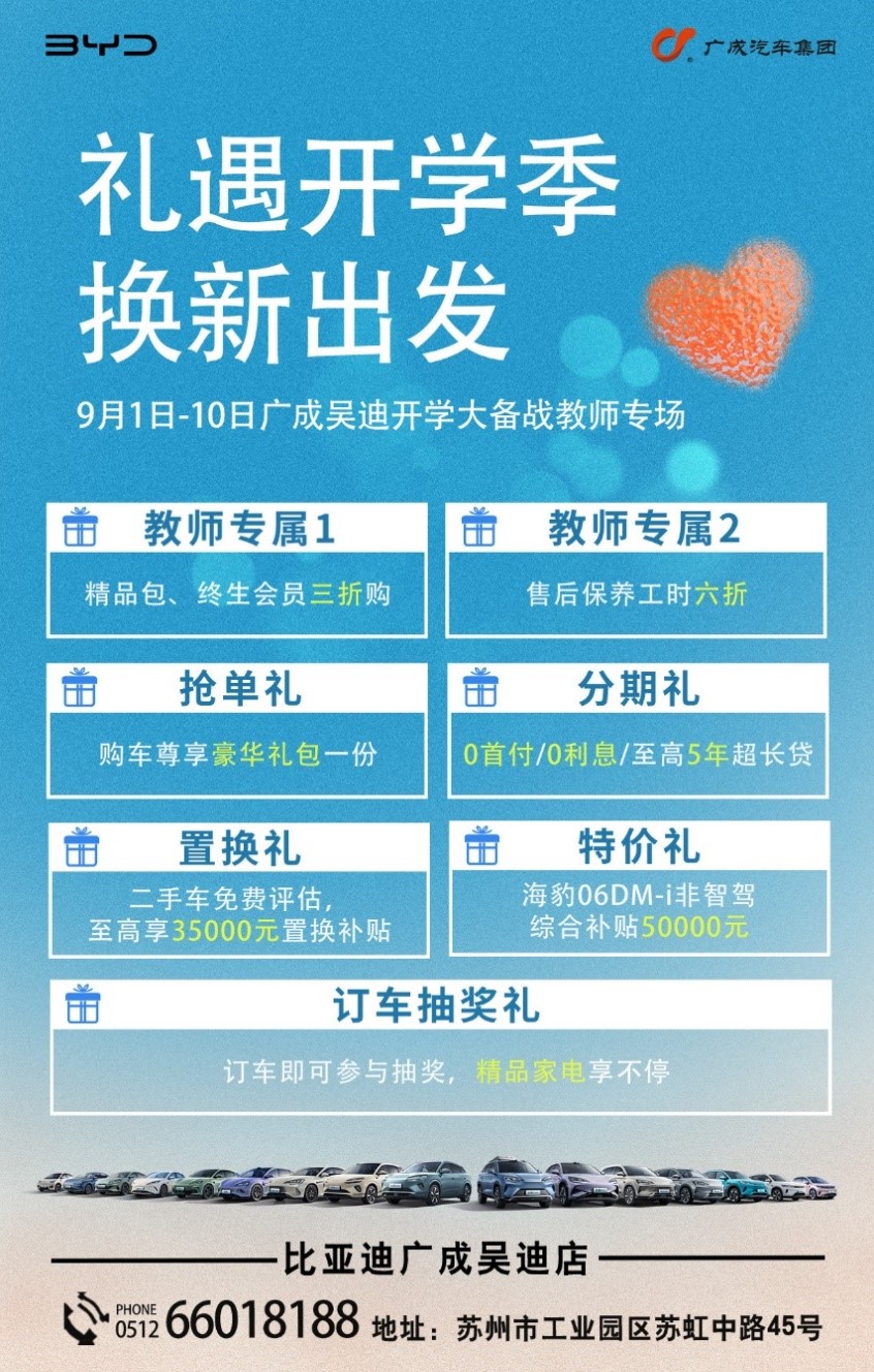 園區(qū)多家4S店推出購車特惠活動,讓教師們在這個特殊的節(jié)日里,實現(xiàn)優(yōu)惠購車,享受出行的便捷與舒適。蘇州比亞迪廣成吳迪店推出教師專屬精品包、終生會員三折購、售后保養(yǎng)六折等活動,另有搶單禮、置換禮、抽獎禮等超值禮遇活動,海豹06DM-i非智駕綜合補貼高達50000元。奔馳蘇州中升之星、蘇州比亞迪盛世卓御汽車、蘇州中升雷克薩斯汽車等品牌,為教師提供2000-3000元全系購車優(yōu)惠,助力老師們以優(yōu)惠價格挑選心儀座駕,開啟便捷出行新體驗。