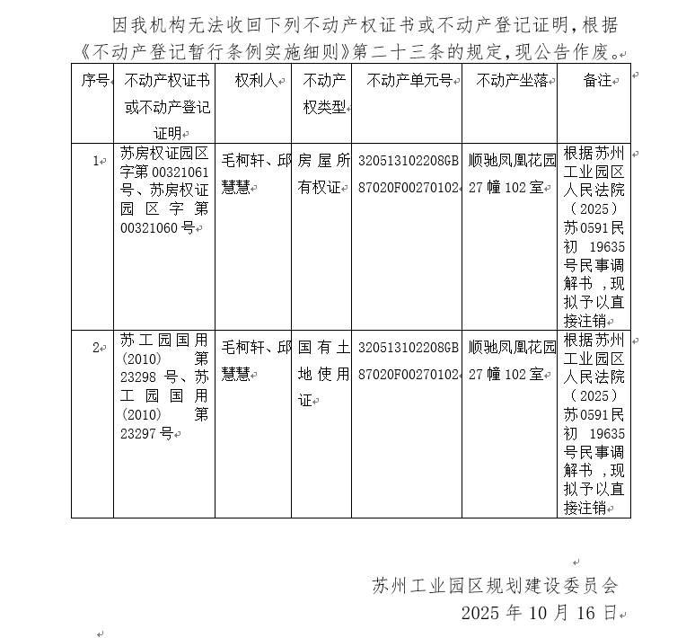 不動(dòng)產(chǎn)權(quán)證書(shū)/登記證明作廢公告蘇園 證廢字2025(0160)號(hào)(順馳鳳凰花園27幢102室)