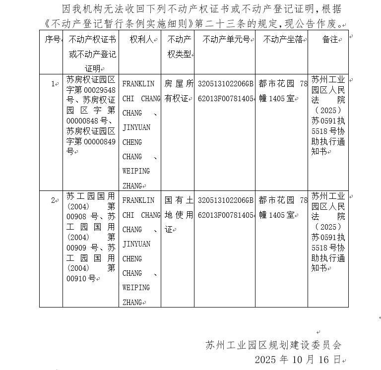 不動(dòng)產(chǎn)權(quán)證書/登記證明作廢公告蘇園 證廢字2025(0155)號(hào)(都市花園78幢1405室)