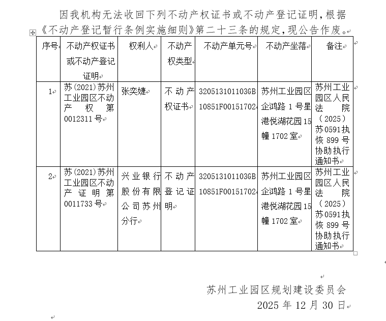不動產權證書/登記證明作廢公告蘇園 證廢字2025(0203)號(星港悅湖花園15幢1702室)