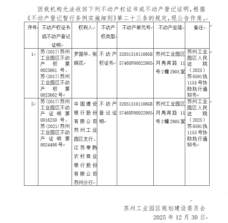 不動產權證書/登記證明作廢公告蘇園 證廢字2025(0190)號(蘇州工業(yè)園區(qū)月亮灣路11號2幢2905室)