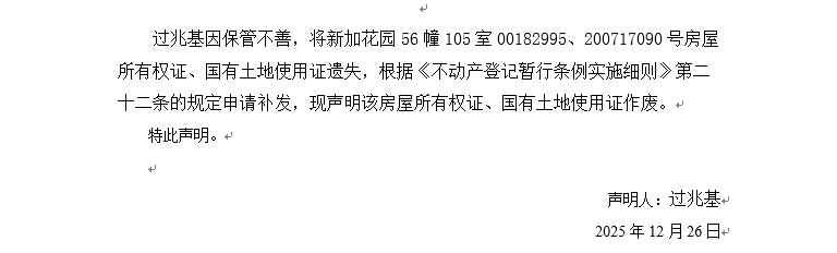 關于新加花園56幢105室00182995、200717090號房屋所有權證、國有土地使用證遺失聲明