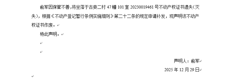 關于古婁二村47幢101室20230019461號不動產權證書遺失聲明