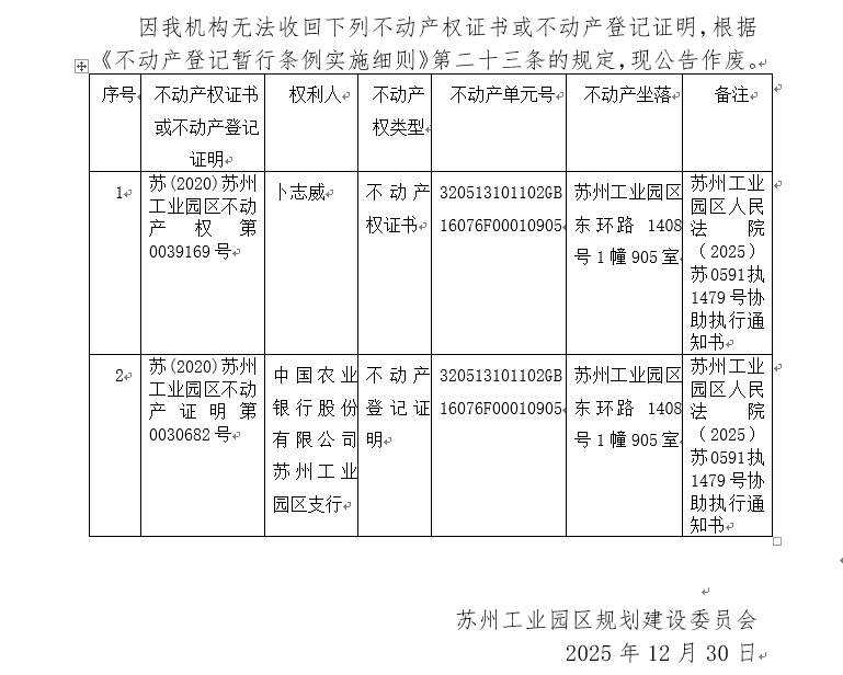 不動產權證書/登記證明作廢公告蘇園 證廢字2025(0199)號(蘇州工業園區東環路1408號1幢905室)