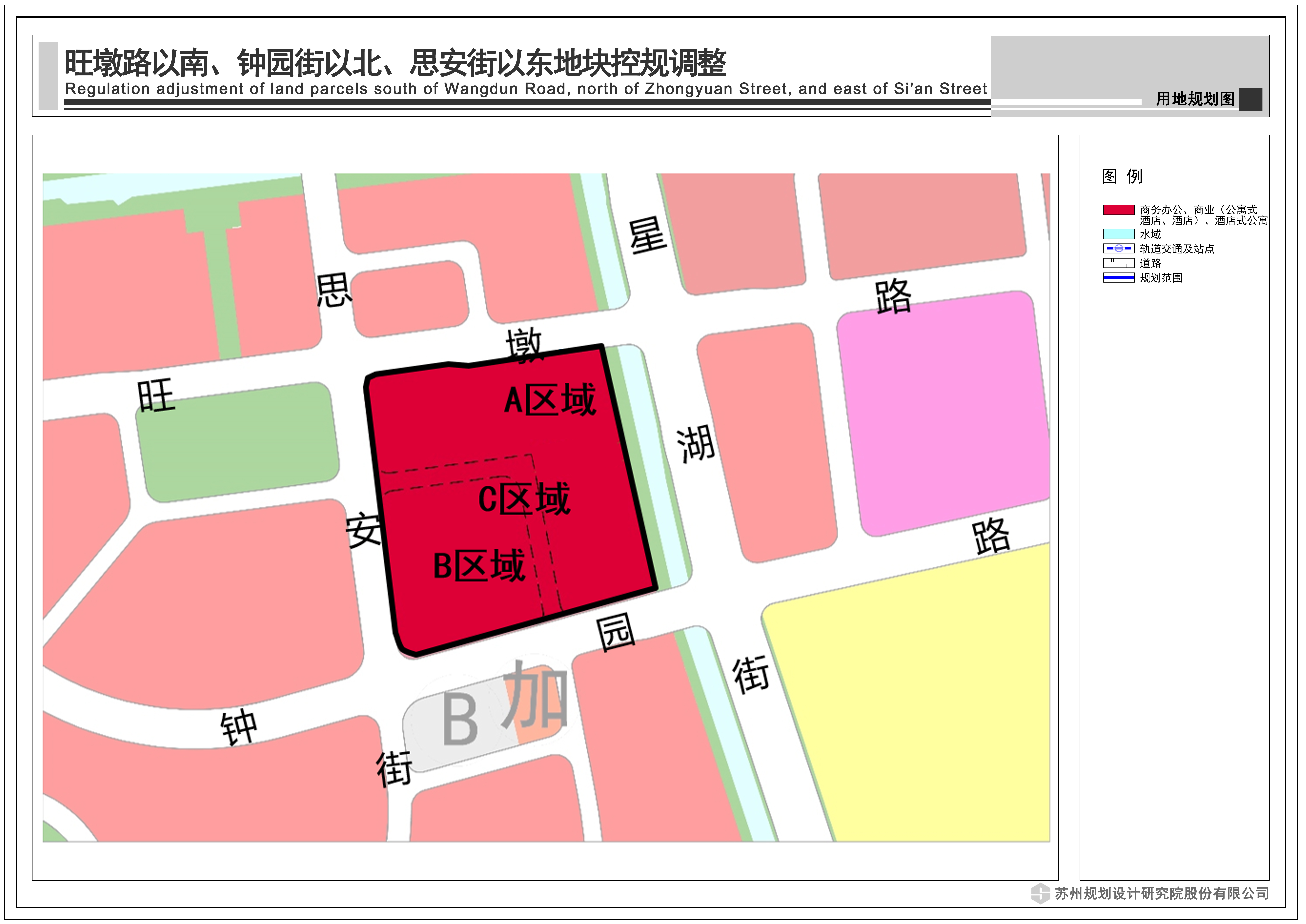 為滿足經濟社會發展需求,調整用地性質為商務辦公、商業(公寓式酒店、酒店)、酒店式公寓混合用地,明確地塊規劃控制指標及A區域、B區域、C區域3個區域的控制內容,其中規劃建筑高度限高380米。