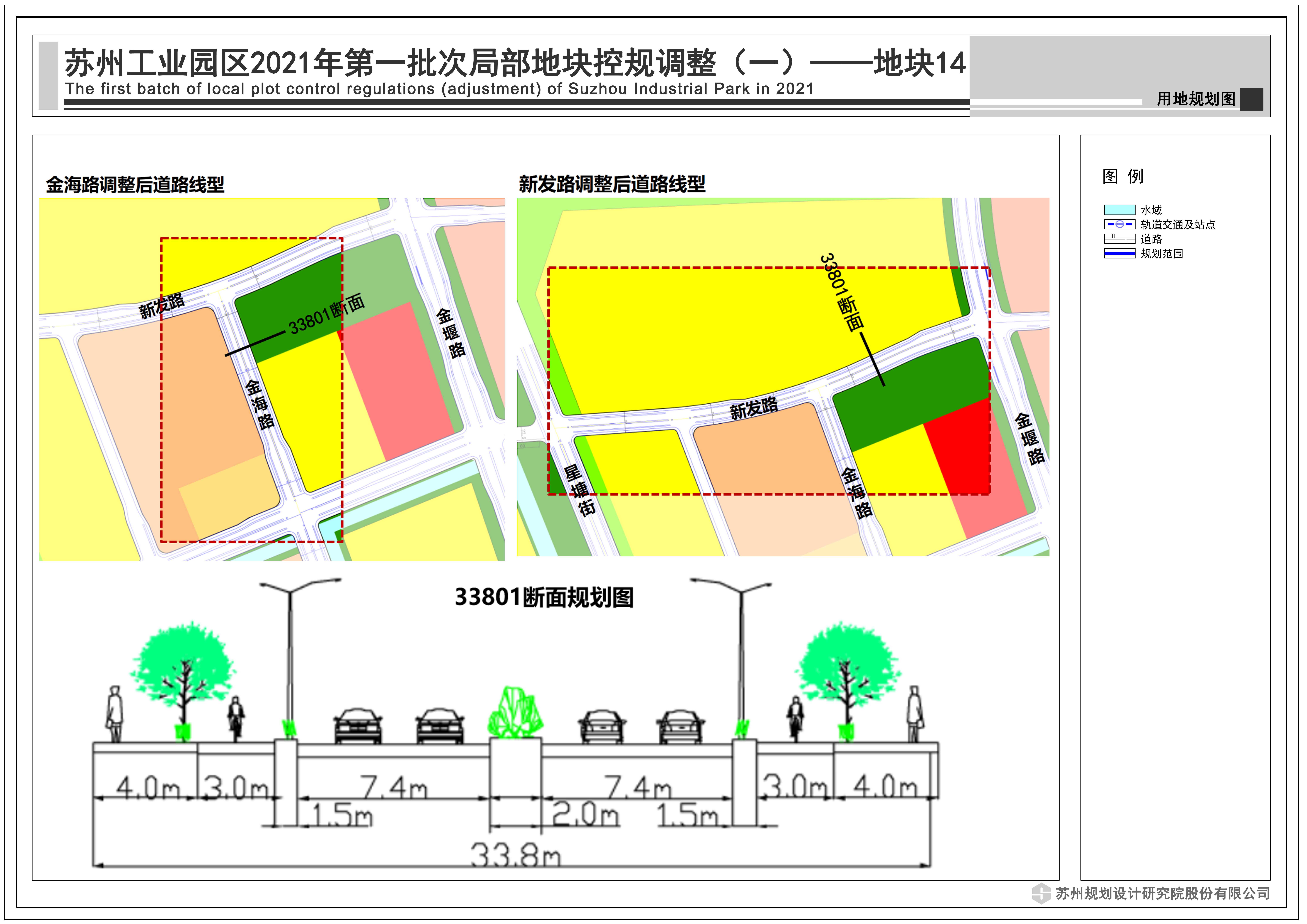 為緩解區域高峰時期的擁堵情況,改善區域交通出行條件,新發路和金海路道路斷面由原規劃24米(雙向2車道、一塊板),調整至33.8米(雙向4車道、四塊板)。