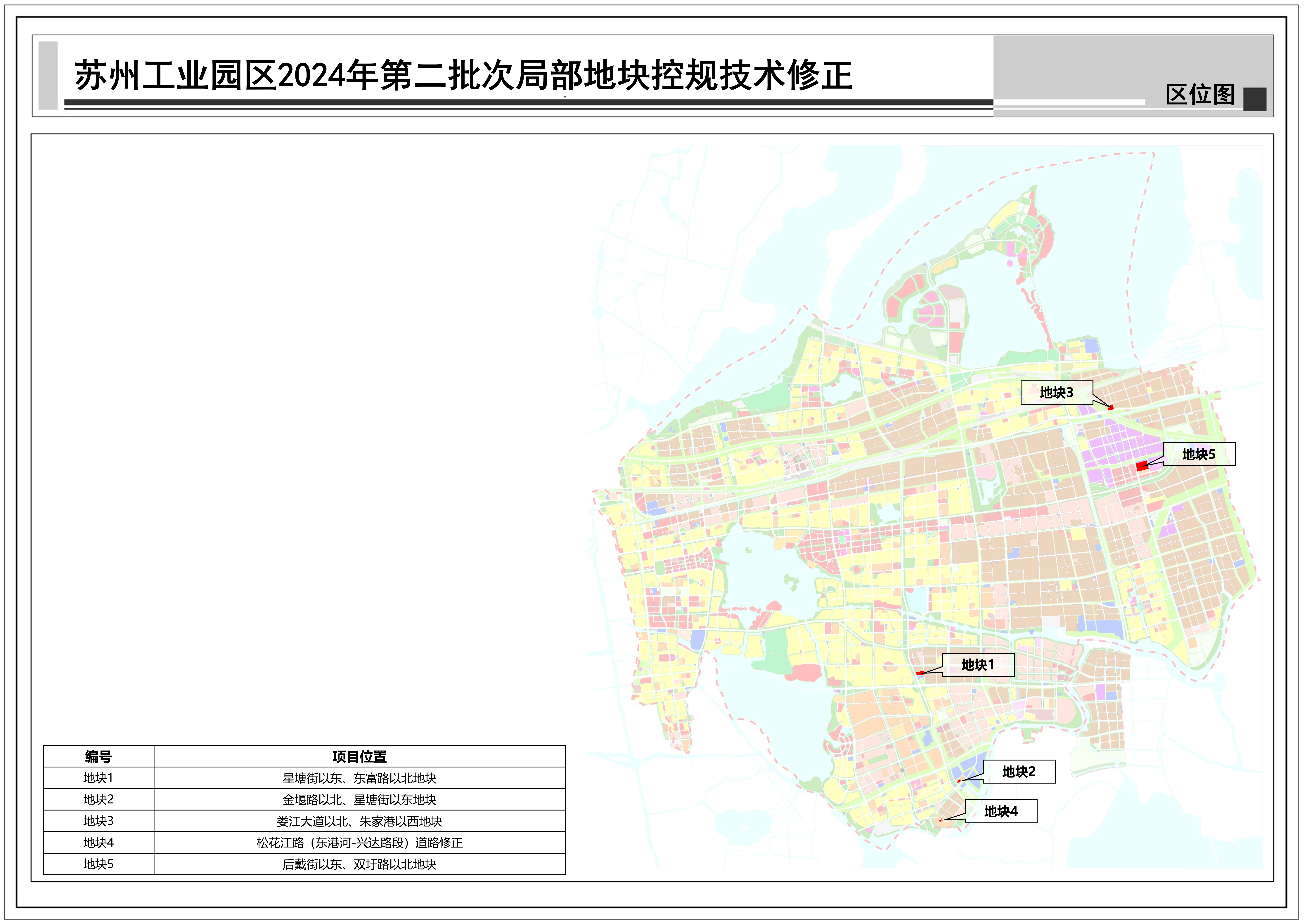 蘇州工業園區2024年第二批次局部地塊控規技術修正:共包括5個地塊,總用地面積約0.19平方公里,詳見附圖區位圖。