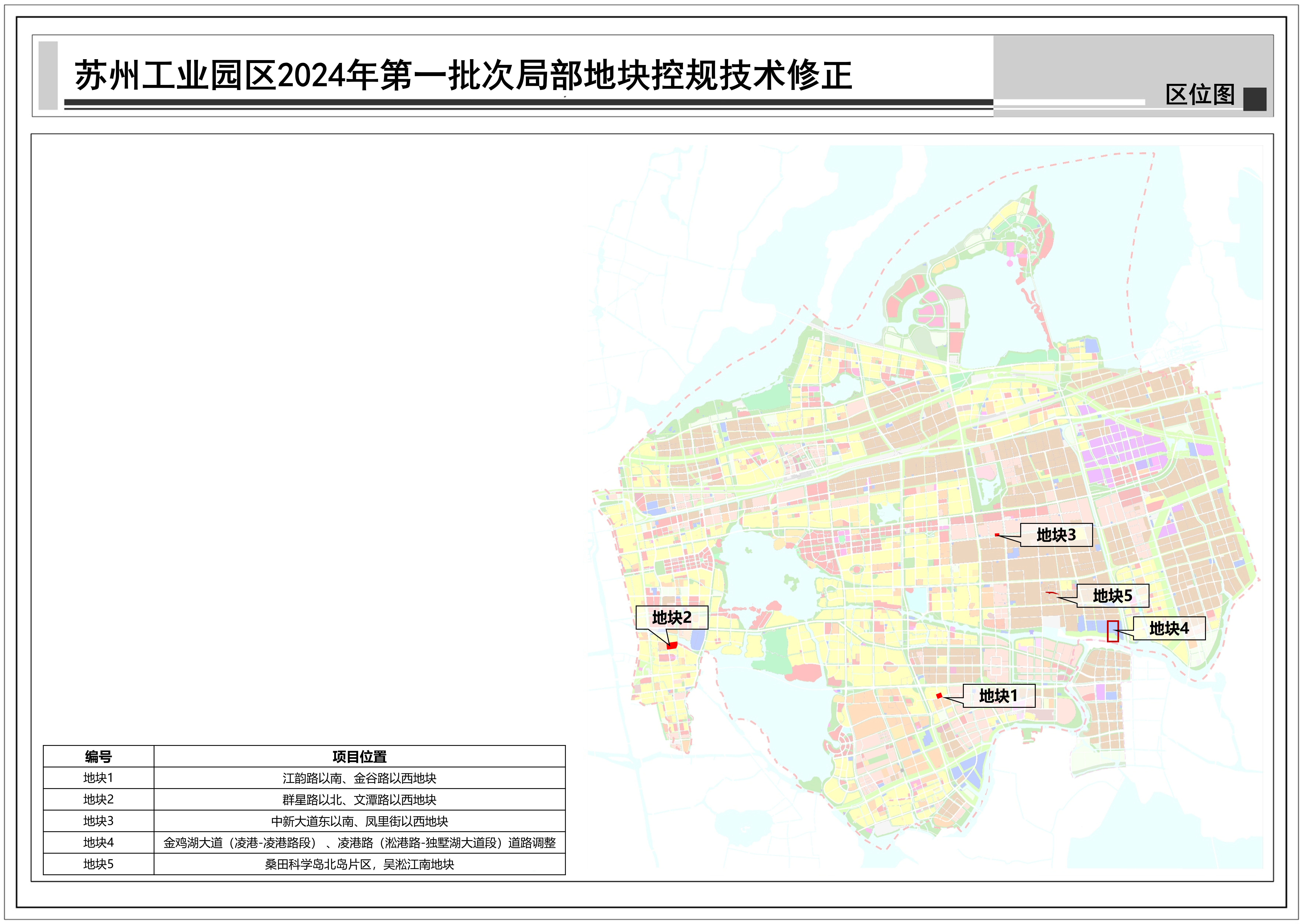 蘇州工業園區2024年第一批次局部地塊控規技術修正:共包括5個地塊,總用地面積約0.13平方公里,詳見附圖區位圖。