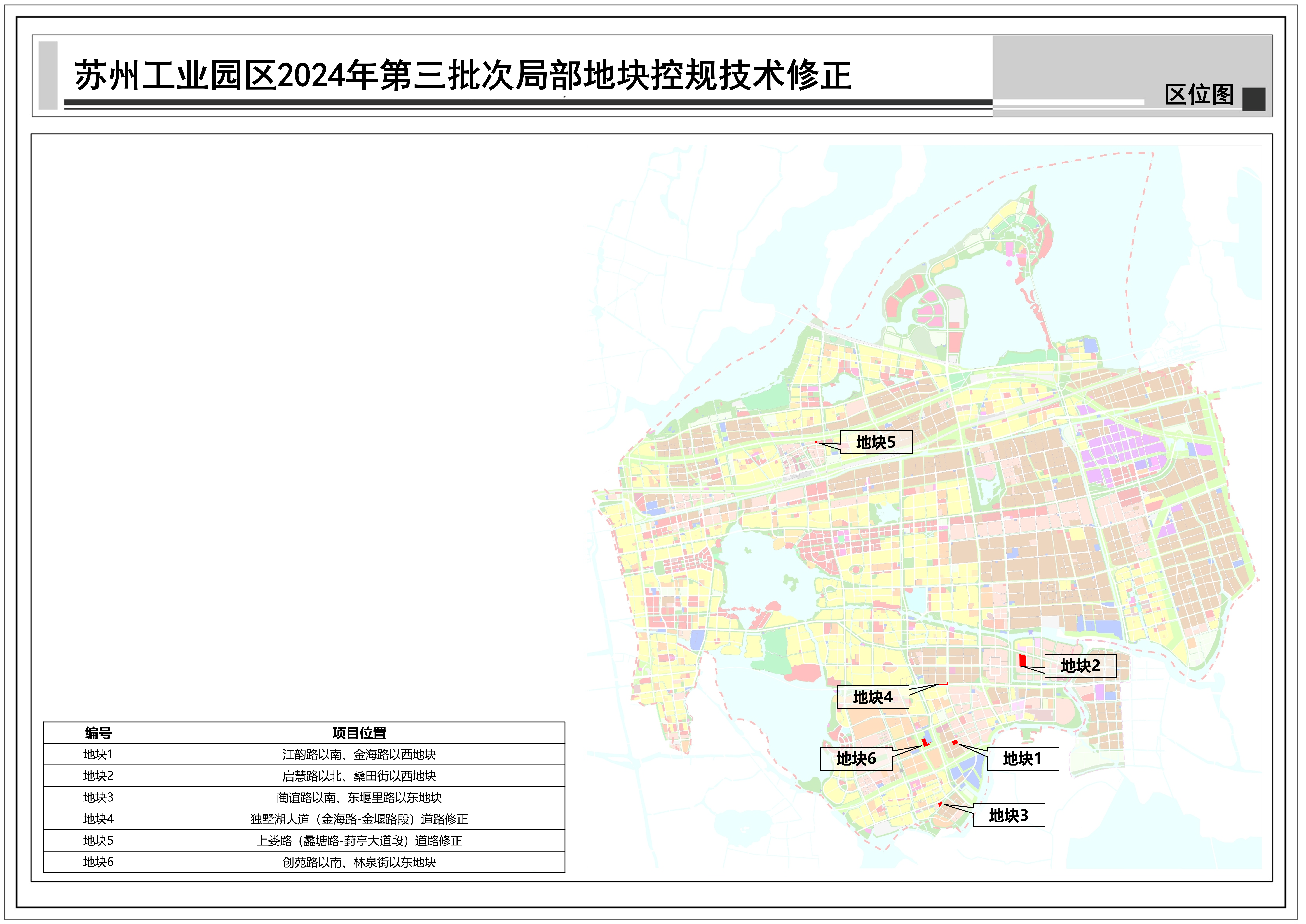 蘇州工業園區2024年第三批次局部地塊控規技術修正:共包括6個地塊,總用地面積約0.25平方公里,詳見附圖區位圖。