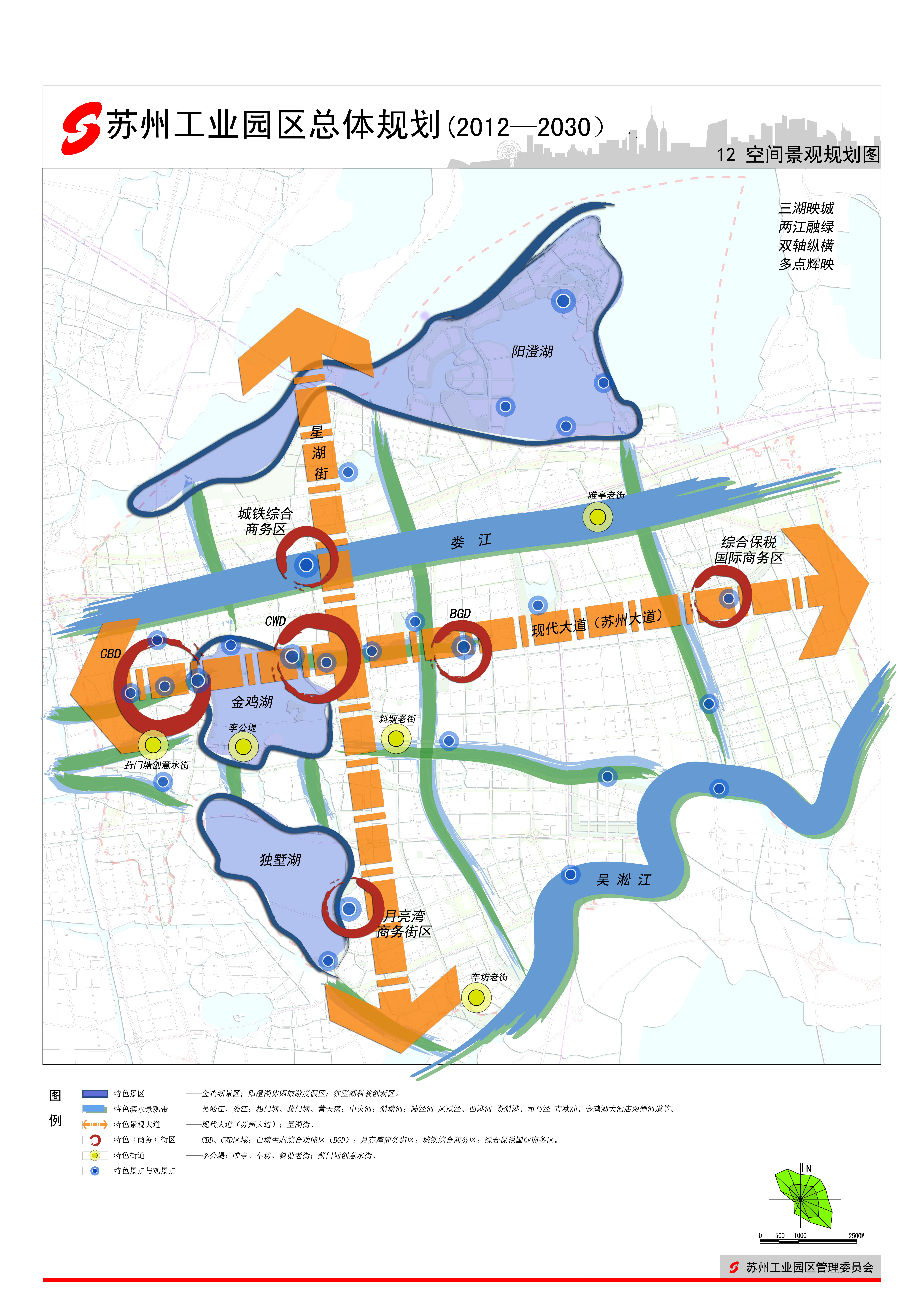 “兩主、三副、八心、多點”的中心體系結構。“兩主”,即兩個城市級中心,包括蘇州市中央商務區(CBD)、蘇州東部新城中央商業文化區(CWD)和白塘生態綜合功能區(BGD)。“三副”,即三個城市級副中心,即城鐵綜合商務區、月亮灣商務區和國際商務區。“八心”,即八個片區中心。