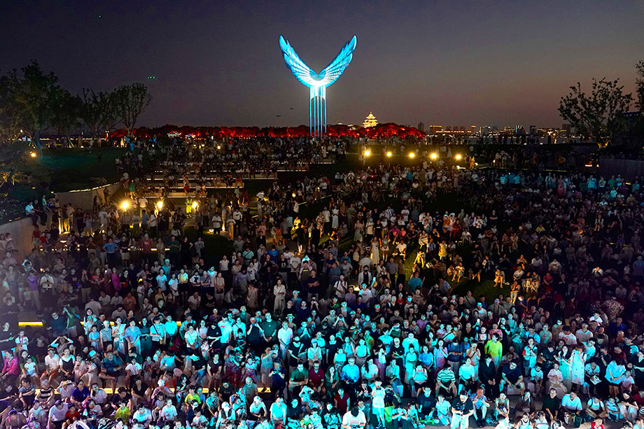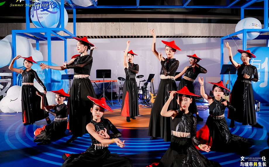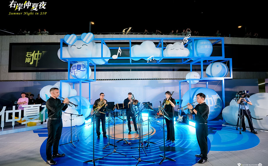 園區が丹念に作り出した蕓術、文化、公共生活が融合する都市ランドマークである金鶏湖右岸ラウンジは、蘇州の繊細な趣きと開放的な國際的気質を兼ね備えている。「右岸の真夏の夜」は「ボーダレスアート」をコンセプトに、イタリア、スペイン、ベネズエラなど海外の友人の多文化表現がある上に、地元アーティストの創作もあり、さらには研究開発従事者や青少年など様々な人々が參加している。