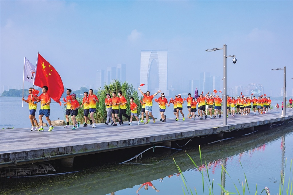 昨天,蘇州工業(yè)園區(qū)金雞湖畔,一群跑友開展國慶長跑活動,以奔跑之姿為祖國母親慶生。查正風攝(視覺蘇州供圖)