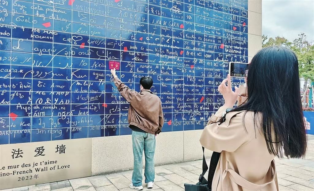 昨日,園區(qū)李公堤的中法愛(ài)墻,游客手持結(jié)婚證留影紀(jì)念,讓美麗秋日為自己的愛(ài)情作證。