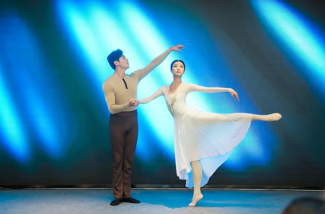 現(xiàn)場,蘇州芭蕾舞團以柔美與力量交融的《鵲橋》片段拉開帷幕,藍調(diào)追光下,舞者裙擺劃出透亮弧線,仿佛將江南水韻融入足尖芭蕾的韻律之中。