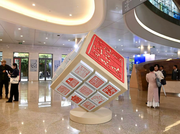 本次展覽突破傳統(tǒng)篆刻展陳模式,以“科技+藝術(shù)”賦能文化傳播。展覽主題印“印記園區(qū)印向未來(lái)”以園區(qū)標(biāo)志性建筑東方之門(mén)、藝術(shù)中心、飛翔雕塑等為主體造型,通過(guò)全息棱鏡技術(shù)動(dòng)態(tài)呈現(xiàn)印章作品,讓觀眾直觀感受“江南文化”與“現(xiàn)代科技”的碰撞,實(shí)現(xiàn)傳統(tǒng)藝術(shù)與現(xiàn)代科技的碰撞與賦能。展覽突破傳統(tǒng)篆刻展的邊界,創(chuàng)新融入新內(nèi)容、新題材、新設(shè)計(jì)、新造型、新材料與新科技。參展印章的材料選擇極為多元,除傳統(tǒng)印材外,陶瓷、樹(shù)脂、空心玻璃微珠等十幾種新材料驚艷亮相。機(jī)器刻制、3D打印、激光雕刻、彩色噴繪等10余種科技治印方法在展覽中廣泛應(yīng)用,各種新材料與新技術(shù),讓傳統(tǒng)篆刻藝術(shù)煥發(fā)活力。