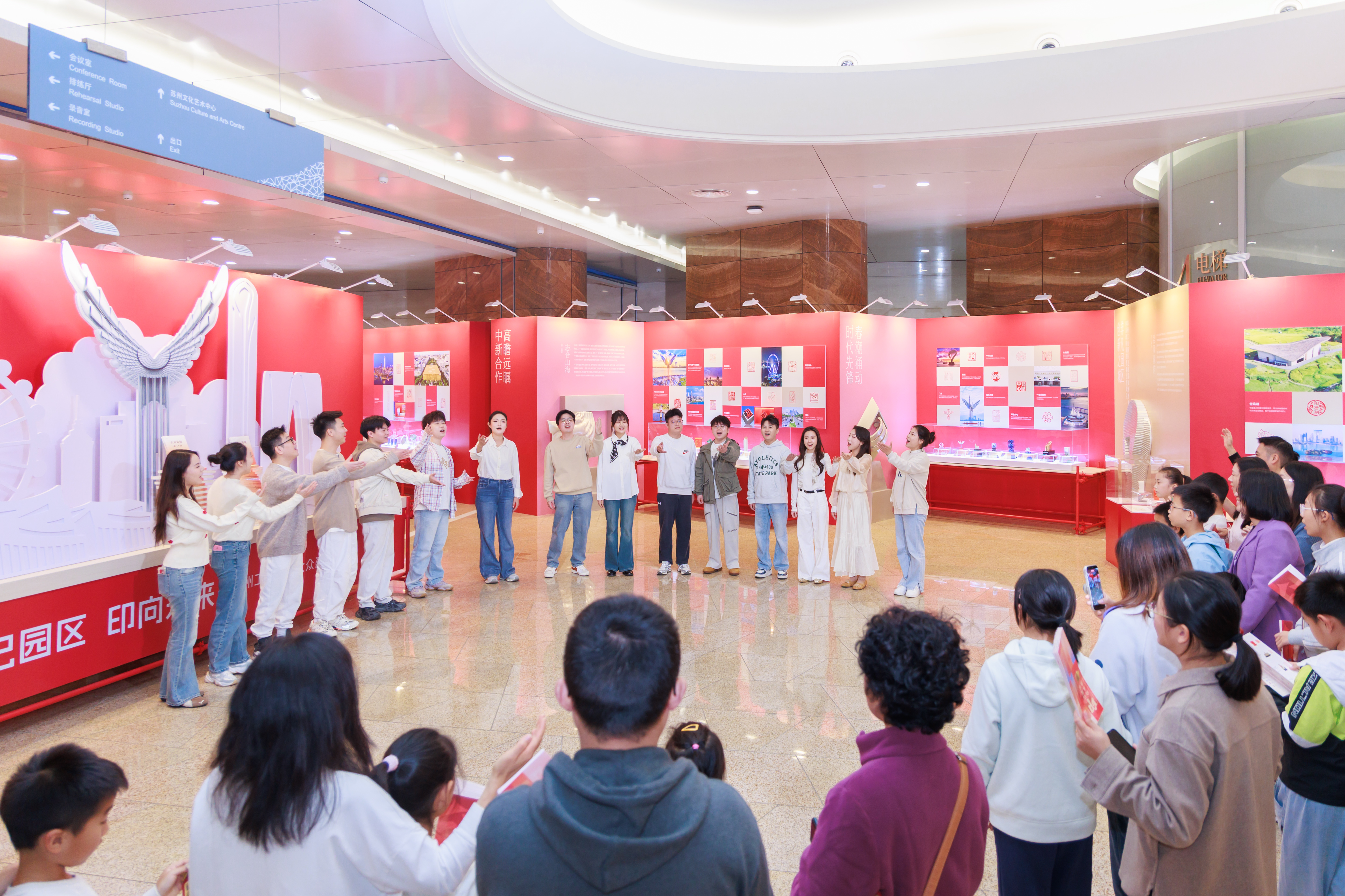 直播鏡頭跟隨導覽人的腳步,深入解讀了展覽的兩大構成部分。第一部分“印記園區”以94枚全新創作的印章,構建出“領航壁畫”“志合山?!薄皡秋L湖韻”“勇立潮頭”“盛世江南”五大篇章。這些作品不僅凝結了園區篆刻愛好者與專業工作者的創意巧思,更特別聚焦于園區的經濟發展、科技創新、自然景觀與產城融合圖景進行創作,讓古老的篆刻藝術與園區的現代化發展深度交融。