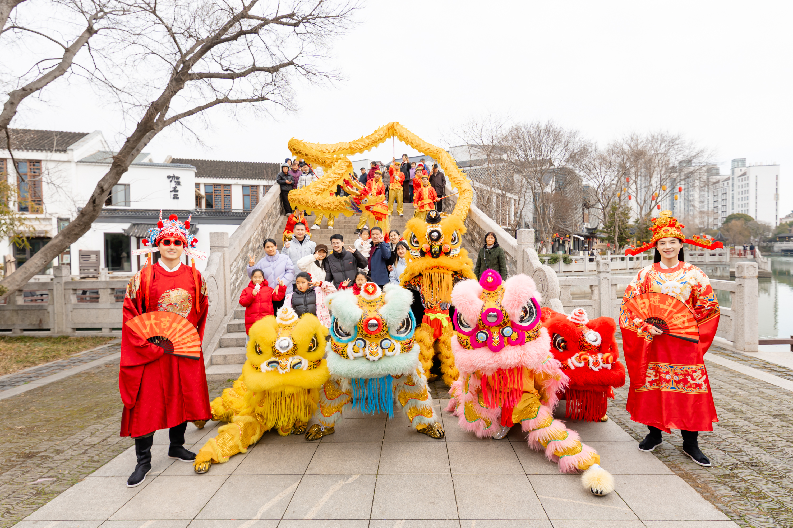 非遺演出更是精彩紛呈。木鳥象劇團帶來的非遺燈彩主題巡游將剪紙、年畫、風箏等元素幻化于華服與燈彩,交織成流動的光影劇場;大年初一,夏國璋龍獅團以梅花樁、一柱擎天等高樁表演獻上了精彩的開年好戲。