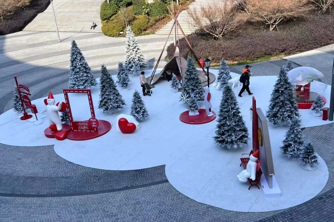 在蘇州奧體中心商業(yè)廣場,頭戴紅色尖角帽的軟萌撲拉PULA帶著對雪國的全部想象,將這里裝點成夢幻之地。鋪著仿真雪的空間里,霧凇燈串營造出冬日的松弛感,巨型水晶球裝置裝滿禮物和小雪人,雪屋休憩區(qū)和專屬打卡框則為市民游客與PULA合影留出足夠空間。