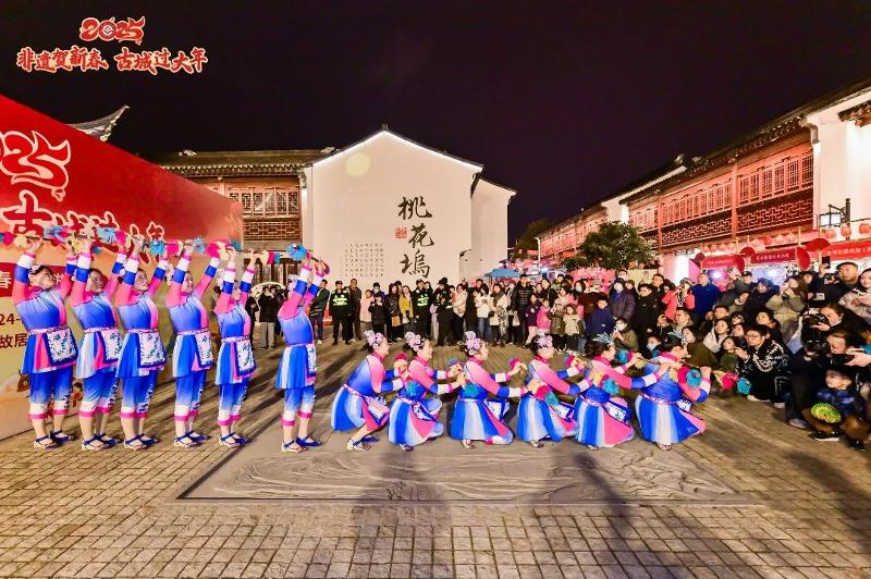 在桃花塢古色古香的背景映襯下,來自園區(qū)勝浦街道的“浦韻非凡連廂隊(duì)”隊(duì)員們也為市民游客奉獻(xiàn)了一場(chǎng)精彩絕倫的打連廂表演《圓融》。
