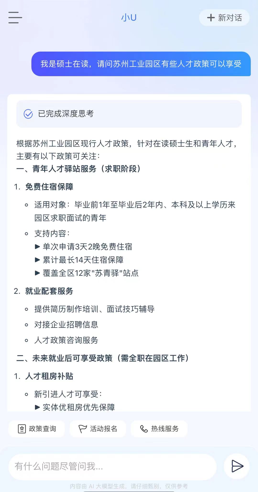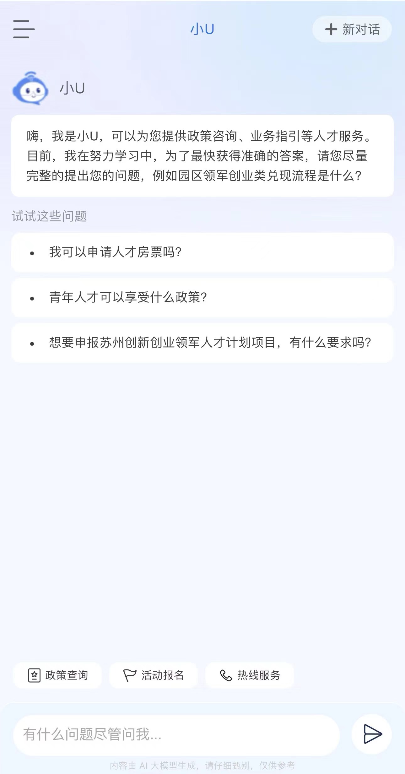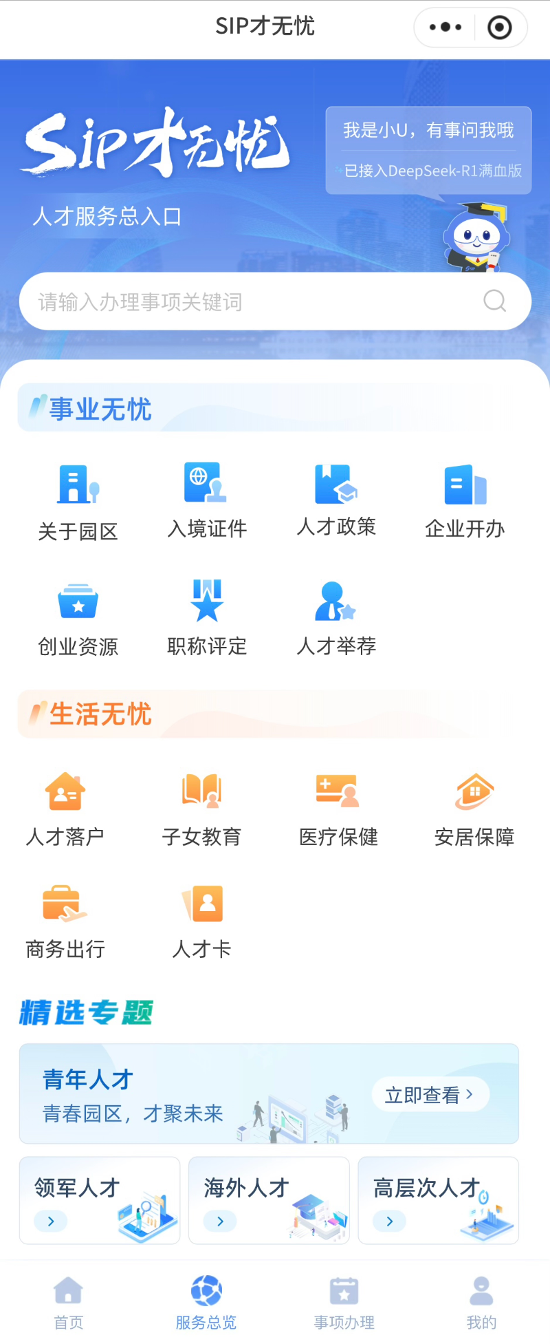 “SIP才無(wú)憂”深度聚焦提升人才的使用體驗(yàn),通過(guò)接入DeepSeek-R1“滿血版”,全新推出首個(gè)高智版AI助手“小U”,構(gòu)建智能化人才服務(wù)體系,實(shí)現(xiàn)“政策秒配、服務(wù)無(wú)界”。