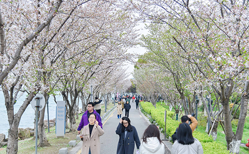 區(qū)內(nèi)企事業(yè)單位職工和周邊市民齊聚在獨(dú)墅湖櫻花大道,共同解鎖這場櫻花下的奇趣之旅。