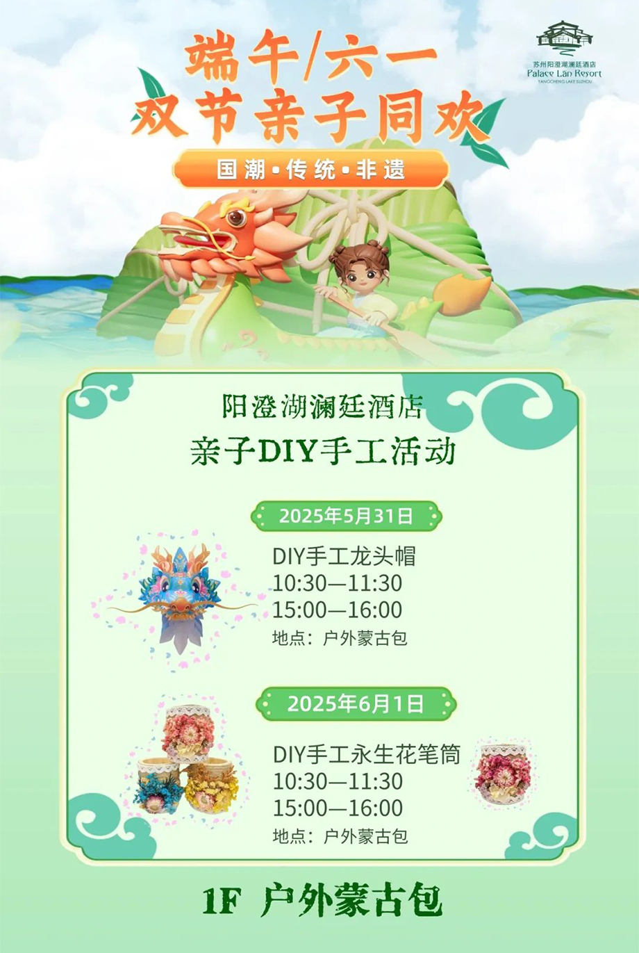 陽澄湖瀾廷酒店推出親子DIY手工活動,帶領大家親手制作龍頭帽、永生花筆筒,還有DIY非遺團扇、DIY漢服等豐富項目,讓游客們沉浸式感受端午氛圍,體驗中華優(yōu)秀傳統(tǒng)文化魅力。