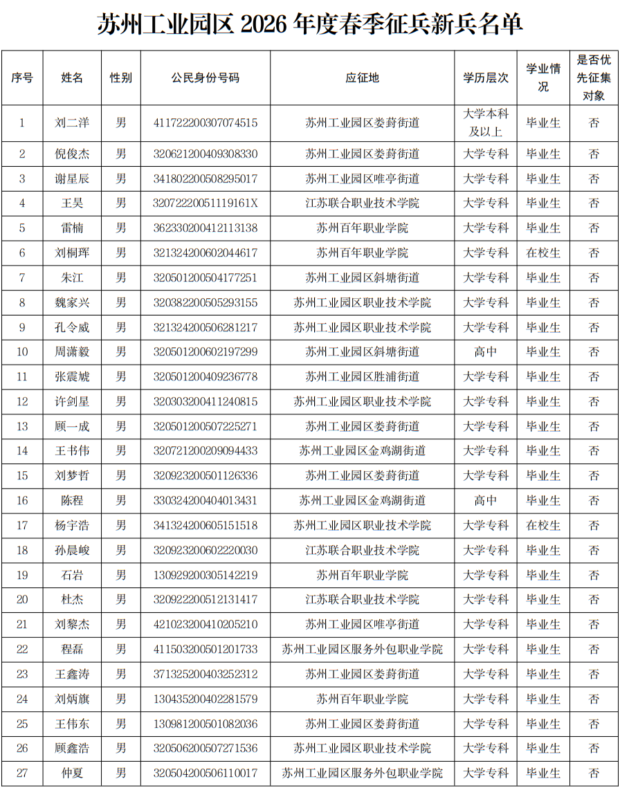 根據省、市征兵工作要求,蘇州工業園區征兵辦按照身體檢查、政治考核、役前教育、集體定兵會等程序,批準了41名應征青年入伍,現將人員名單向社會公布,并接受各界監督。