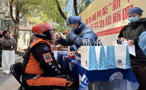 在健康服務(wù)區(qū)域,社區(qū)對(duì)接專業(yè)醫(yī)護(hù)人員為騎手們提供免費(fèi)的口腔義診項(xiàng)目。醫(yī)護(hù)人員仔細(xì)地用探照燈為每一位騎手檢查牙齒,并根據(jù)檢查結(jié)果和騎手的疑問給出專業(yè)的建議,提醒他們注意健康用牙、定期檢查。到了暖“新”物資發(fā)放環(huán)節(jié),社區(qū)志愿者們將一份份實(shí)用又保暖的護(hù)膝和手套送到騎手手中,同時(shí)將社區(qū)的關(guān)愛和問候帶給騎手。一位外賣小哥收到物資后說道:“平時(shí)工作忙,很少有時(shí)間能去看牙,這次正好復(fù)查了。社區(qū)的活動(dòng)很貼心,準(zhǔn)備的保暖用品也很實(shí)用,讓我們?cè)诤涞亩旄惺艿搅思皶r(shí)的溫暖。”