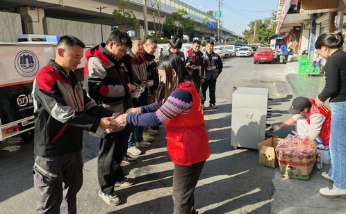 暖意手作區,烤紅薯的香甜氣息與手工創作的溫馨氛圍交織融。“紅管”志愿者將熱乎乎的紅薯遞到快遞員手中,驅散冬日的寒意;創意手作臺前,大家專注地用彩線、貼布裝飾保暖手套,讓溫暖在指尖傳遞、在親手創作中延續。