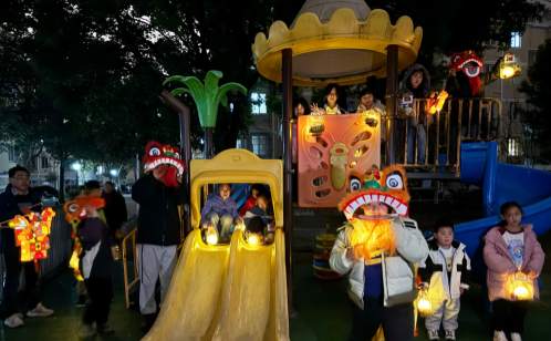 夜幕降臨,華燈初上,活動(dòng)迎來了高潮——“燈火萬家·流動(dòng)的‘XIN’福”花燈巡游。由社區(qū)工作人員、志愿者以及手持自制花燈的親子家庭組成的巡游隊(duì)伍,宛如一條流動(dòng)的燈河。巡游隊(duì)伍從生機(jī)盎然的社區(qū)蔬樂園出發(fā),寓意著耕耘與收獲;隨后蜿蜒穿行至熱鬧的居民樓下,將祝福送到家家戶戶門前;最終抵達(dá)孩子們的樂園社區(qū)游樂場(chǎng),這里是夢(mèng)想起航的地方。一路上,由志愿者和社區(qū)青少年組成的“舞獅隊(duì)”與居民熱情互動(dòng),小獅子調(diào)皮地眨著眼睛,向大家拱手拜年。小朋友們熱情地向沿路的居民贈(zèng)送精致的元宵燈籠,一只只燈籠傳遞到居民手中,點(diǎn)亮了夜色,也溫暖了人心。