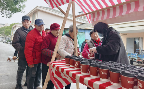 一碗熱氣騰騰的湯圓,是這場相聚中溫情的注腳。金益社區小區門口甜香四溢,社區工作人員、物業人員和“紅色管家”志愿者們早早煮好湯圓,保溫靜置、分裝整齊,遞予過往居民。大家捧著溫熱的瓷碗,有人現場品嘗,有人打包分享,一句句“謝謝”“趁熱吃”讓暖意在街巷間流動。志愿者們還將湯圓送到保安、保潔手中,致敬這些默默堅守一線的守護者。