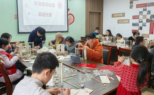 新蘇社區的活動室內,社區婦聯邀請女性同胞們齊聚一堂,將銀柳、冬青與仿真花材精心搭配,插入福桶,再點綴寓意美好的小掛件,一盆盆錯落有致的年宵花漸次成型。親子手作區里,家長與孩子在“紅色管家”志愿者的指導下,共同制作“元宵葫蘆香囊”,穿針引線、填充香料,一個個小巧精致、寓意“福祿雙全”的香囊在協作中成型。活動尾聲,新蘇社區的全體家庭手持作品,在鏡頭前定格下溫馨的全家福;夏家橋社區的元宵主題打卡墻上,一張張笑臉在鏡頭前綻放。鄰里情、親子情交織融合,為這場相聚畫上圓滿句號。