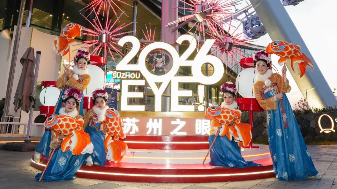 蘇州之眼元宵夜趣味活動(dòng)輪番上線,市民可登高俯瞰萬(wàn)家燈火,參與猜燈謎贏好禮。傍晚時(shí)分,國(guó)風(fēng)舞者手持魚(yú)燈輕盈巡游;科技感十足的機(jī)器狗化身“送福使者”,與游客互動(dòng)打卡,硬核科技與萌趣氛圍碰撞出別樣精彩。