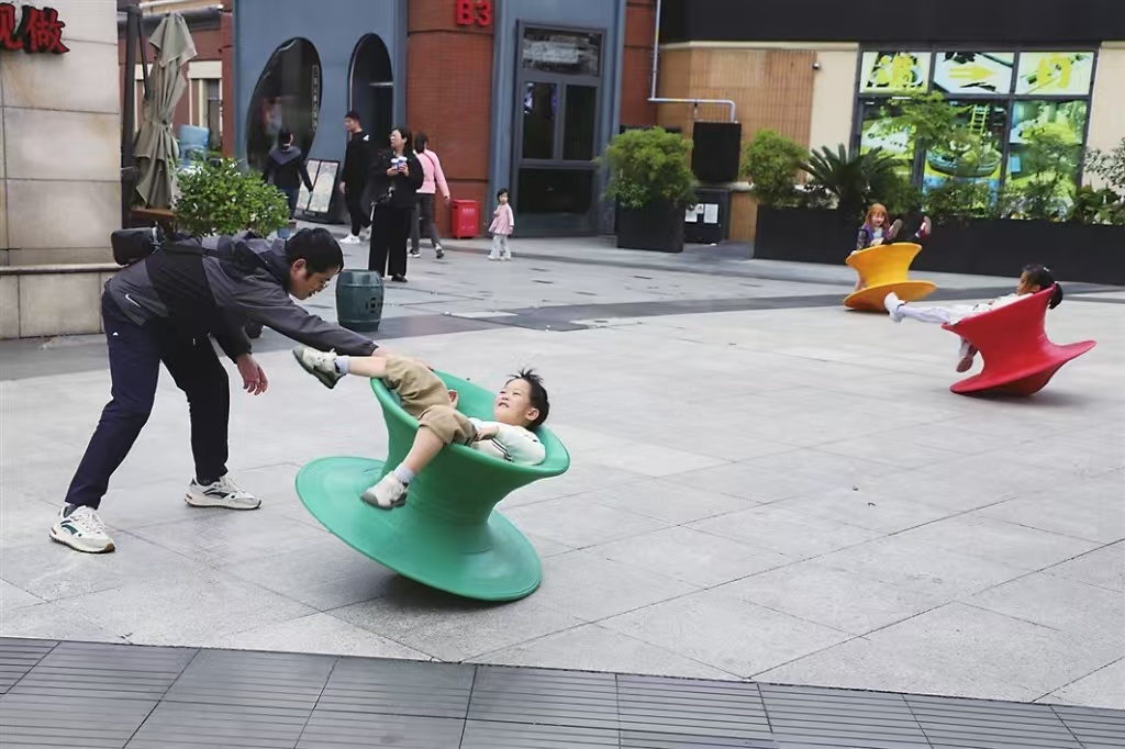蘇州工業園區月光碼頭,小孩坐在“陀螺”里,大人在旁邊轉動“陀螺”,小孩的驚叫聲與歡笑聲此起彼伏。