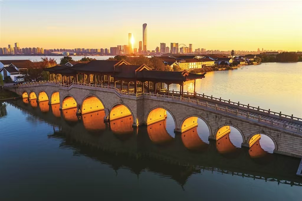 昨晨,陽光穿透金雞湖上凌云橋11個孔洞,形成一個個金色的光環,呈現出奇特的光影效果。