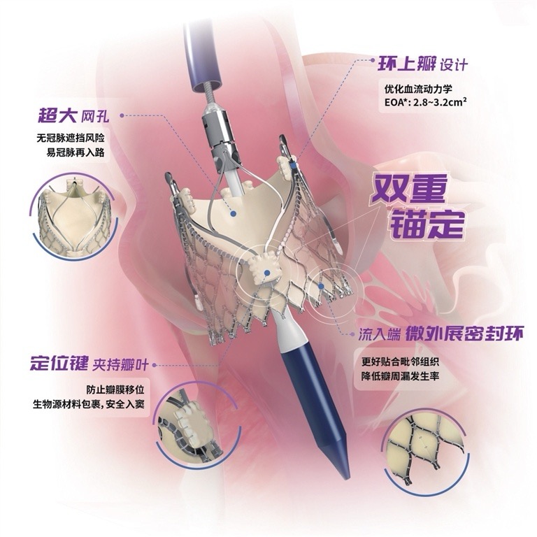 此次新獲批的TaurusTrio經(jīng)導(dǎo)管主動脈瓣系統(tǒng),采用全球首創(chuàng)的一體式定位鍵設(shè)計,徹底攻克了單純主動脈瓣反流患者面臨的器械錨定難題:系統(tǒng)自帶的270°調(diào)彎功能可讓器械和心臟瓣膜更貼合,加上360°全向精準(zhǔn)操控,三個定位鍵可以牢牢“抓住”患者自身的瓣膜,輕松實(shí)現(xiàn)穩(wěn)定固定。同時,瓣膜流入端的微外展密封環(huán),緊密貼合主動脈瓣根部,不用再過度依賴“尺寸放大”的傳統(tǒng)方法來固定瓣膜,這就大大減少了術(shù)后需要裝心臟起搏器的風(fēng)險,也降低了瓣膜裝得過高或過低的概率,進(jìn)一步提升植入的穩(wěn)定性和精準(zhǔn)度。此外,一體式定位鍵還能和患者原生瓣膜的關(guān)鍵位置精準(zhǔn)對齊,讓血液流動更順暢;搭配超大網(wǎng)孔設(shè)計,最大程度保留了心臟冠脈血管的通路,避免影響后續(xù)治療。