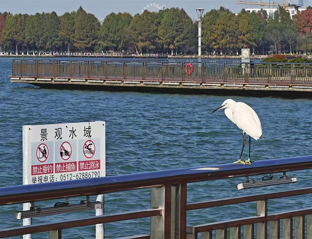 昨天,園區(qū)獨(dú)墅湖畔,一只鷺鳥(niǎo)停留在圍欄上,一旁是禁止捕魚(yú)的相關(guān)標(biāo)識(shí)。