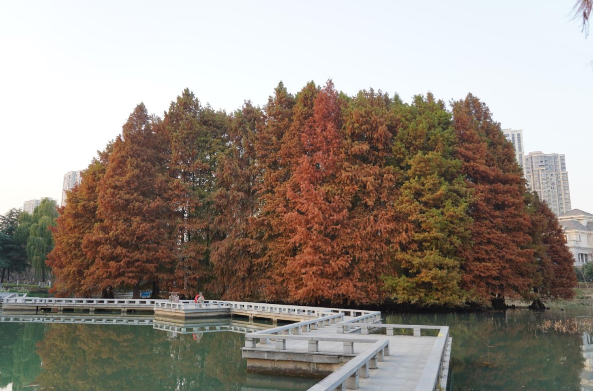 作為開放的城市公共空間,白塘公園在秋冬之際更顯靜謐詩意。公園深處,曲折的石橋靜靜臥于水上,與沿岸紅杉的倒影相映,勾勒出一幅渾然天成的自然畫卷。