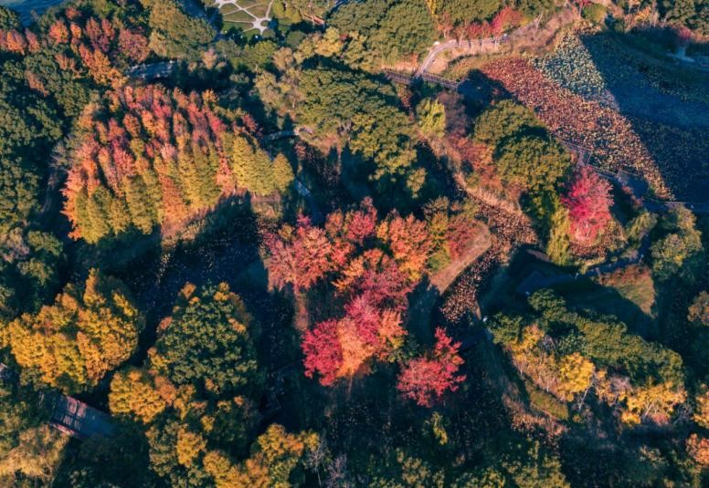 寒風輕拂,秋冬意濃。隨著季節更迭,一幅幅以紅楓、銀杏、水杉為筆觸的斑斕畫卷徐徐展開,在摩登樓宇與自然湖岸之間,勾勒出園區層次豐盈、詩意流動的秋冬盛景。