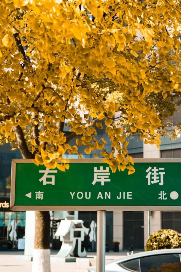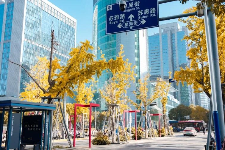 驅車或漫步這條城市中軸線,兩側的高樓構成摩登的天際線,銀杏的金黃主旋律為這幅都市畫卷點上了最明亮的季節色彩。