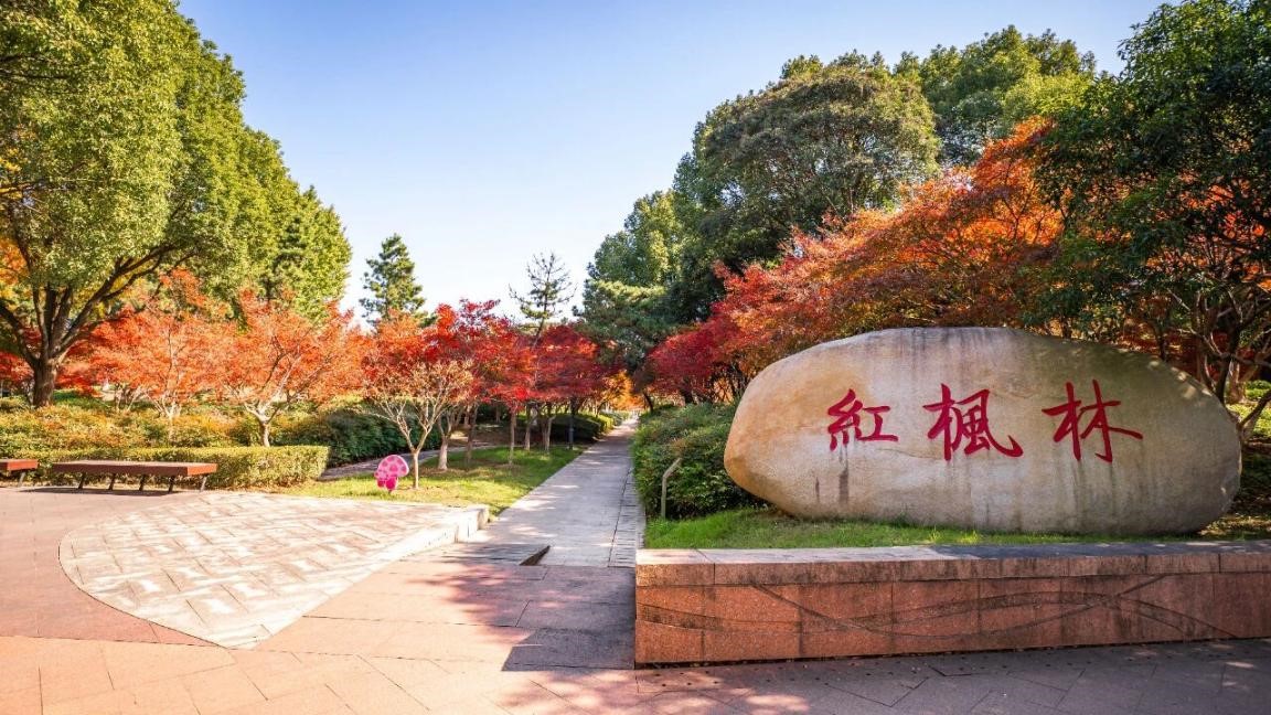 作為園區最具規模的賞楓地,這片開放式公園巧妙地隱匿于都市的繁華之畔。涼意漸深時,500余株紅楓次第染透,陽光穿過枝葉,片片楓葉如同燃燒的火焰。漫步小徑,走過池塘與小橋,城市喧囂被層層楓紅過濾,林間葉隙的光影隨手一拍,便是充滿氛圍感的畫面。