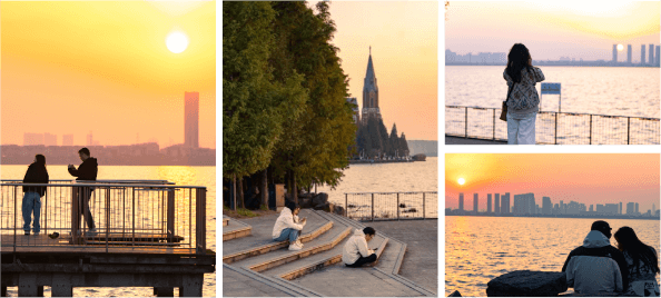The Egrets Park is popular with sunsetlovers. It is common to see people holding up their mobile phones to record thesunsets through their lenses, or simply standing still and watching the lakeand the buildings on the other side of the lake.The sunlight turns soft at dusk, tenderlyfalling on the people as if it was trying to dissipate the fatigue for them. T...