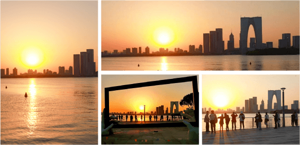 Suzhou Culture and Arts Centre is a goodplace to enjoy sweeping views of sunsets.People are part of the pictures ofsunsets when it is seen through the artistic sculpture “In The Play”, whichfeatures a rectangular frame held up by a pair of hands. At different moments, the setting suncreates different pictures which are fascinating in varied ways. Here is o...