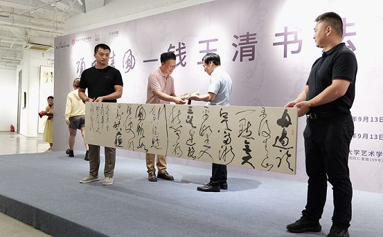At the opening ceremony, the calligrapher presented a work he wrote to the art gallery of the School of Art of Soochow University.