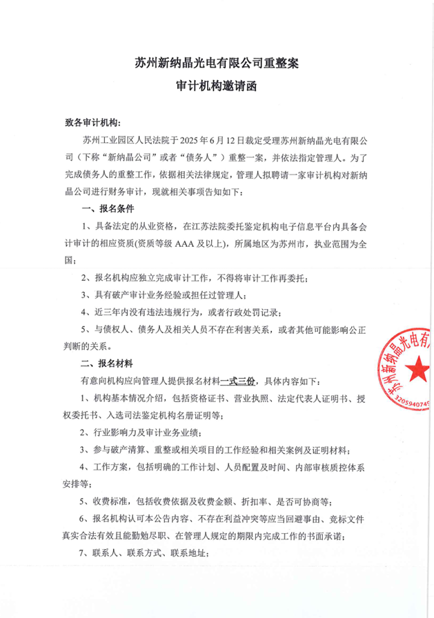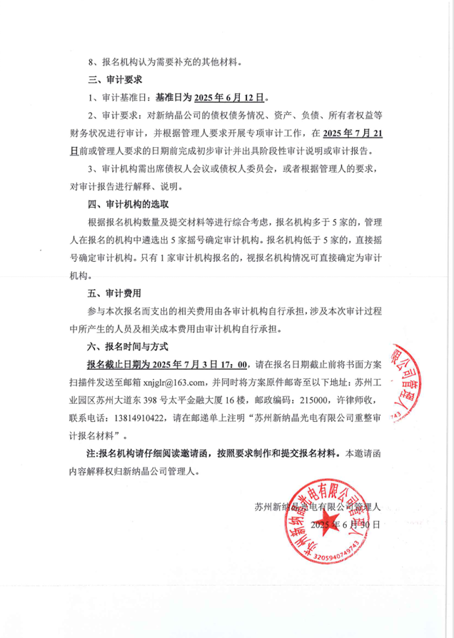 蘇州新納晶光電有限公司關(guān)于公開招募審計機構(gòu)的公告